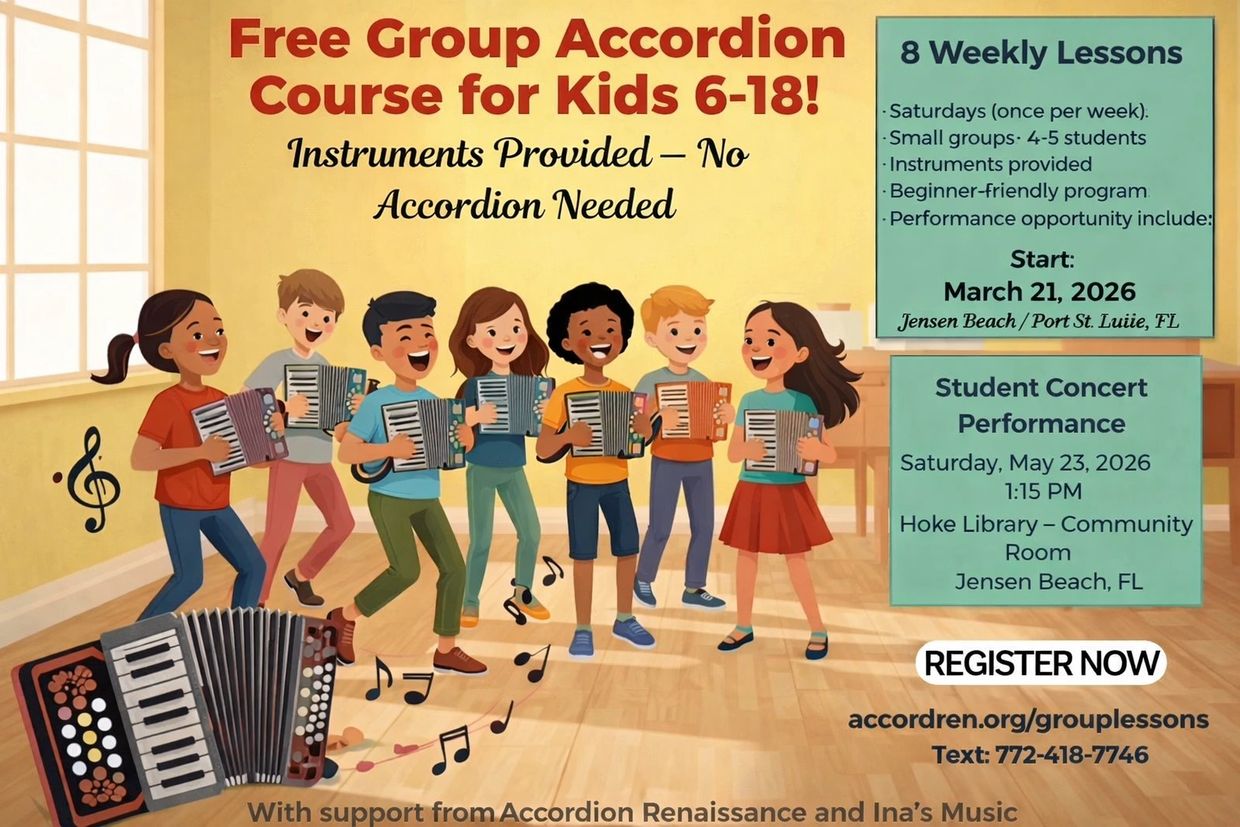 Ina Yakubeika with the support of Accordion Renaissance is offering a free 8-week group accordion course for young musicians ages 6-18. The program includes weekly Saturday lessons focused on beginner technique, rhythm, coordination, ensemble playing, and performance preparation. The course concludes with a live group performance at 1:15 PM, May 23, 2026 at the Hoke Library Community Room. This program is designed to be supportive, engaging, and confidence-building for students new to the accordion.